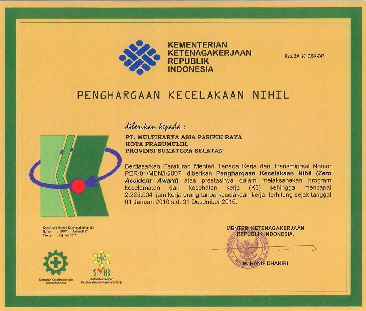 Penghargaan Zero Accident (Kemenaker RI)